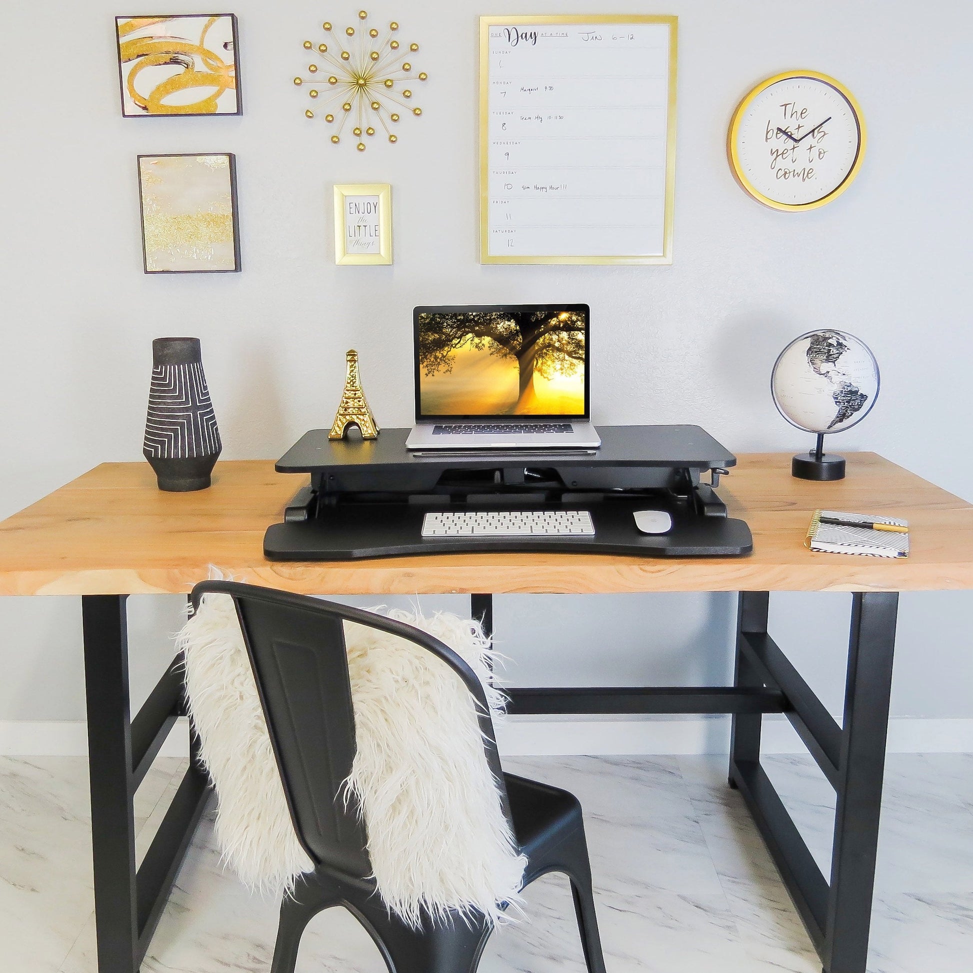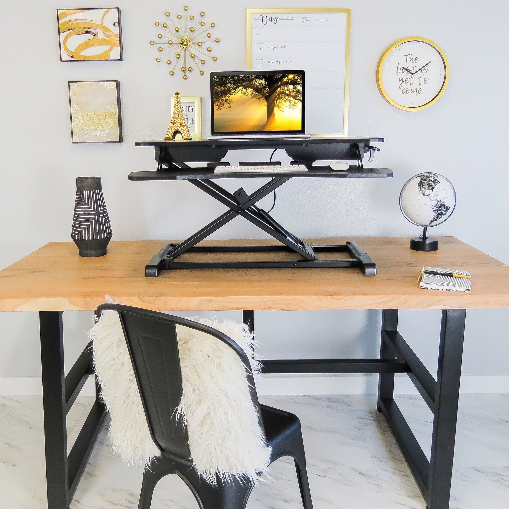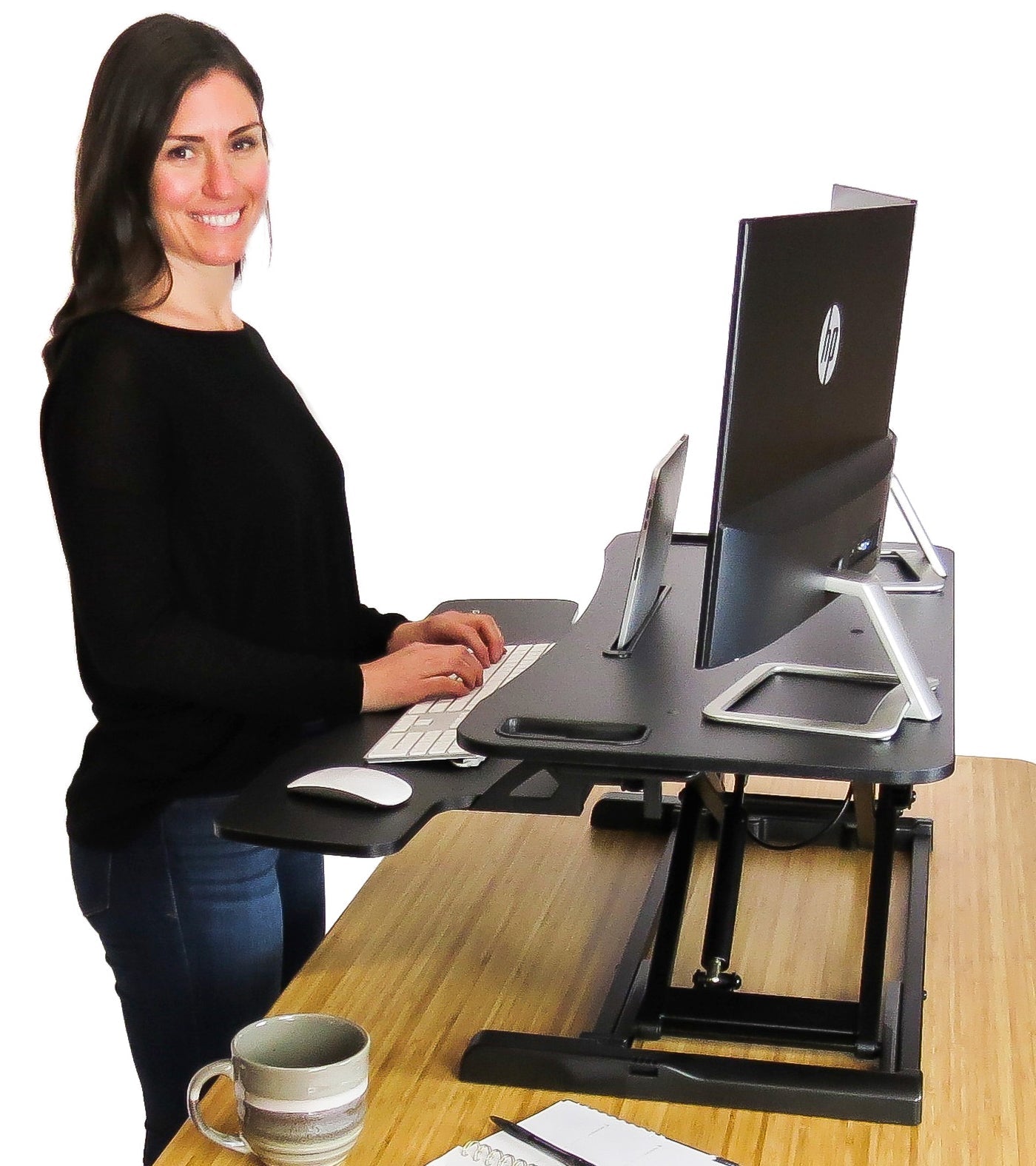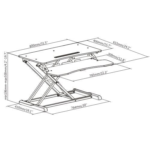 The Desk Riser 32X is a heavy duty 32 inch wide height adjustable standing desk converter that is rises straight up and down. Adjusts smoothly and effortlessly from 4.2-inches to 19.7-inches high. Features a very wide keyboard tray that fits any size keyboard and mouse. Comes in 32-inch and 37-inch wide sizes. A great standing desk for tall people.