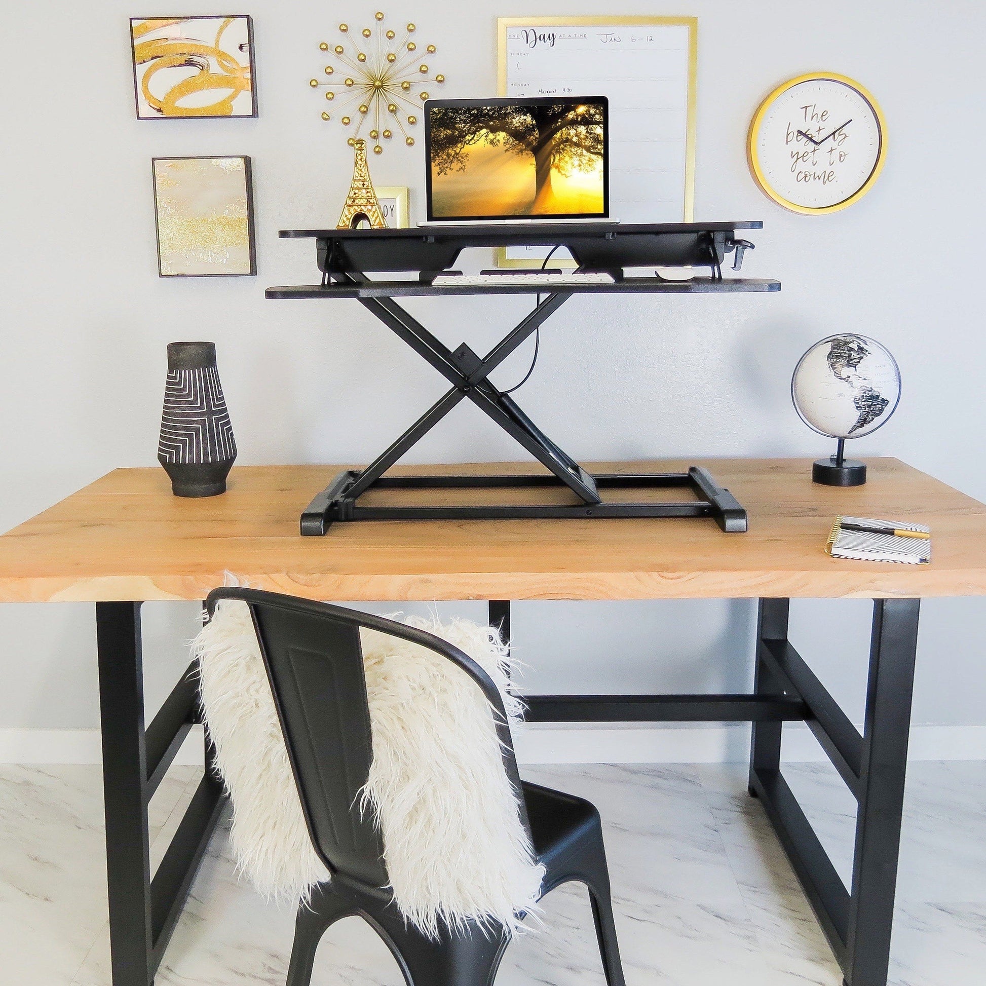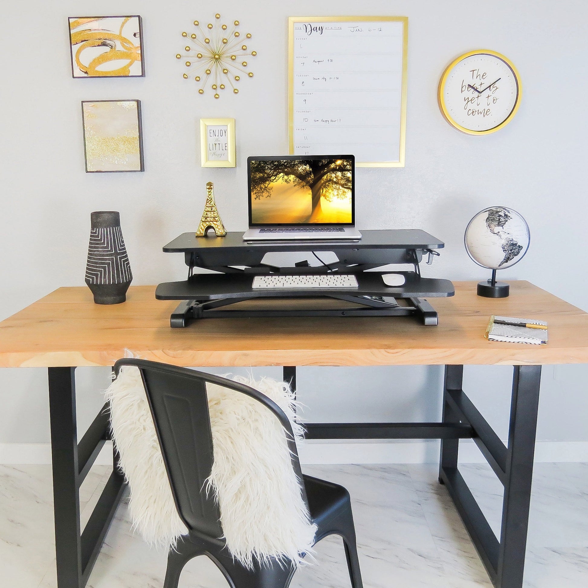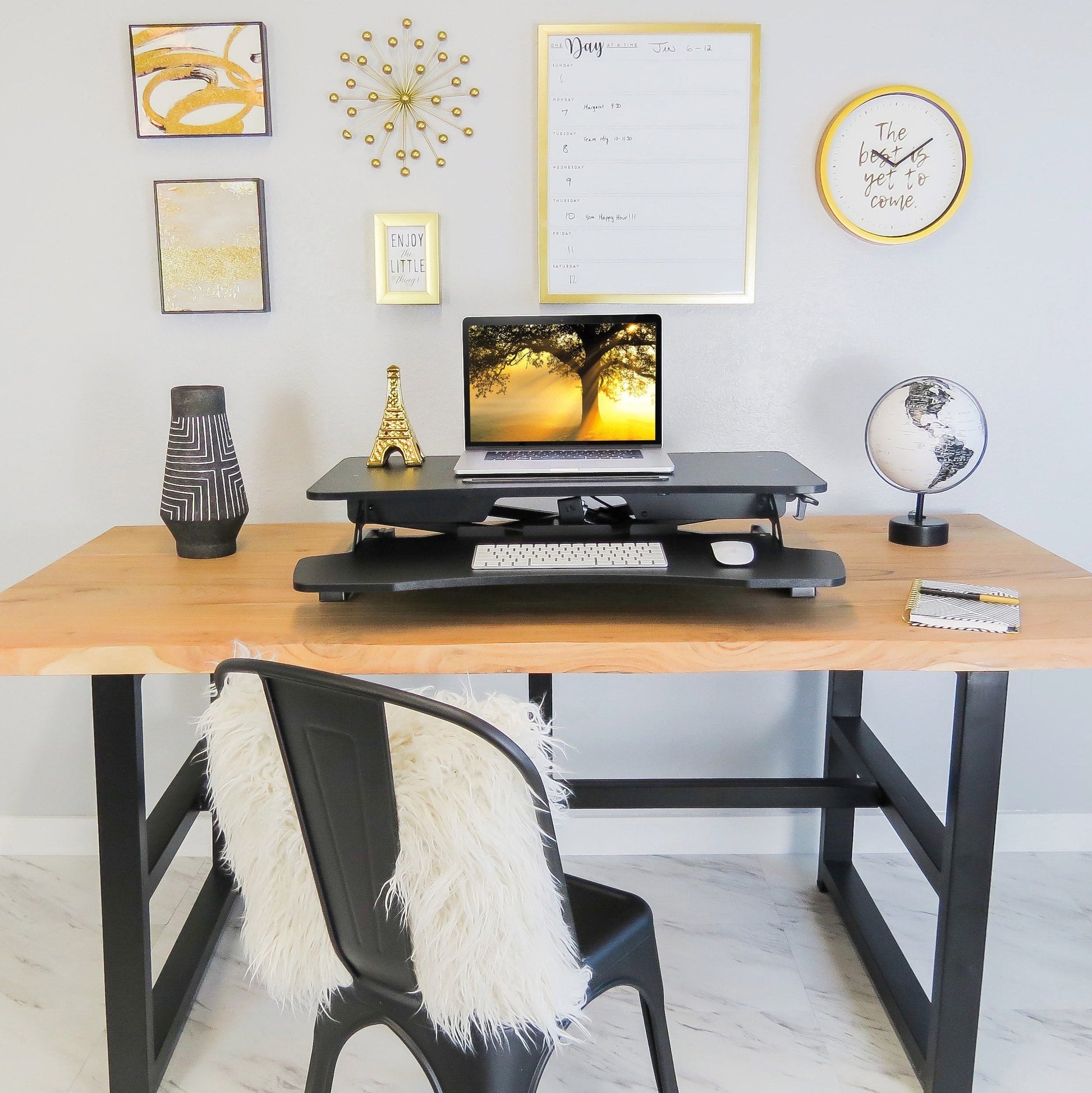 The Desk Riser 32X is a heavy duty 32 inch wide height adjustable standing desk converter that is rises straight up and down. Adjusts smoothly and effortlessly from 4.2-inches to 19.7-inches high. Features a very wide keyboard tray that fits any size keyboard and mouse. Comes in 32-inch and 37-inch wide sizes. A great standing desk for tall people.