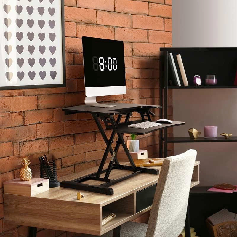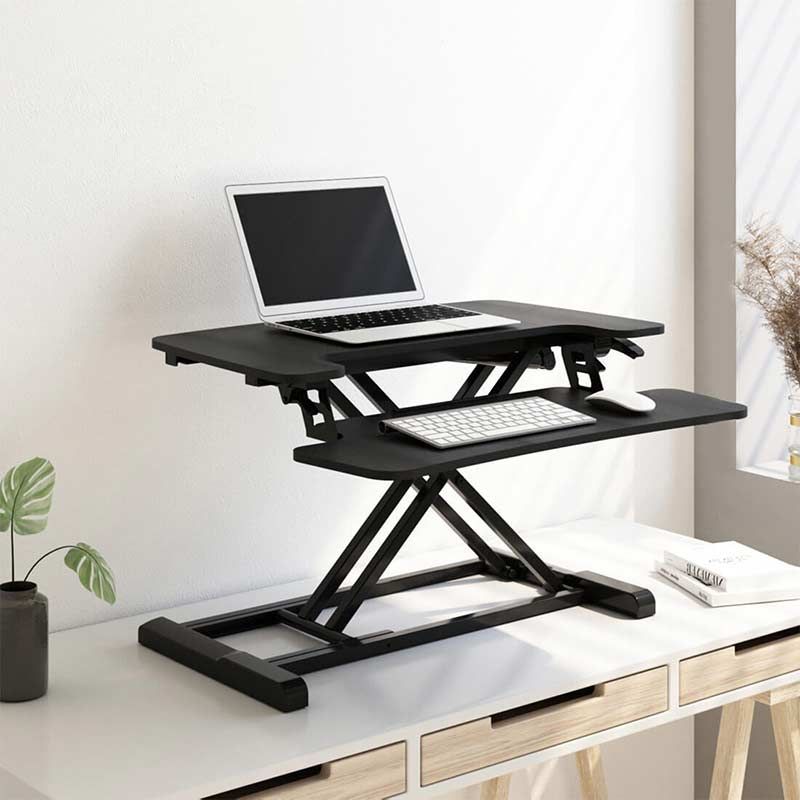 The Arca 28 is a heavy duty 28 inch wide height adjustable standing desk converter that is rises straight up and down. Adjusts smoothly and effortlessly from 4.7-inches to 19.7-inches high. Features a very wide keyboard tray that fits any size keyboard and mouse. A great standing desk for tall people.
