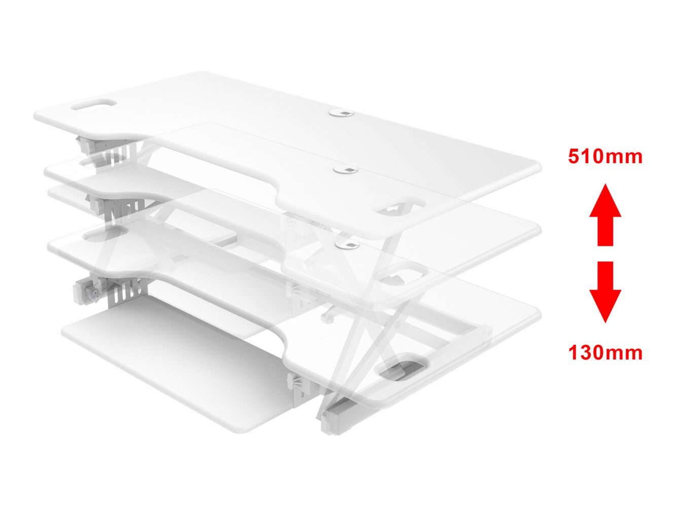 A: The 32-inch and 37-inch wide desk risers work best for people up to around 6ft tall when sitting on a 29in high desk. The 40-inch and 46-inch wide desk risers rise another 3.5 inches higher and work for anyone up to 6ft 4in tall. |