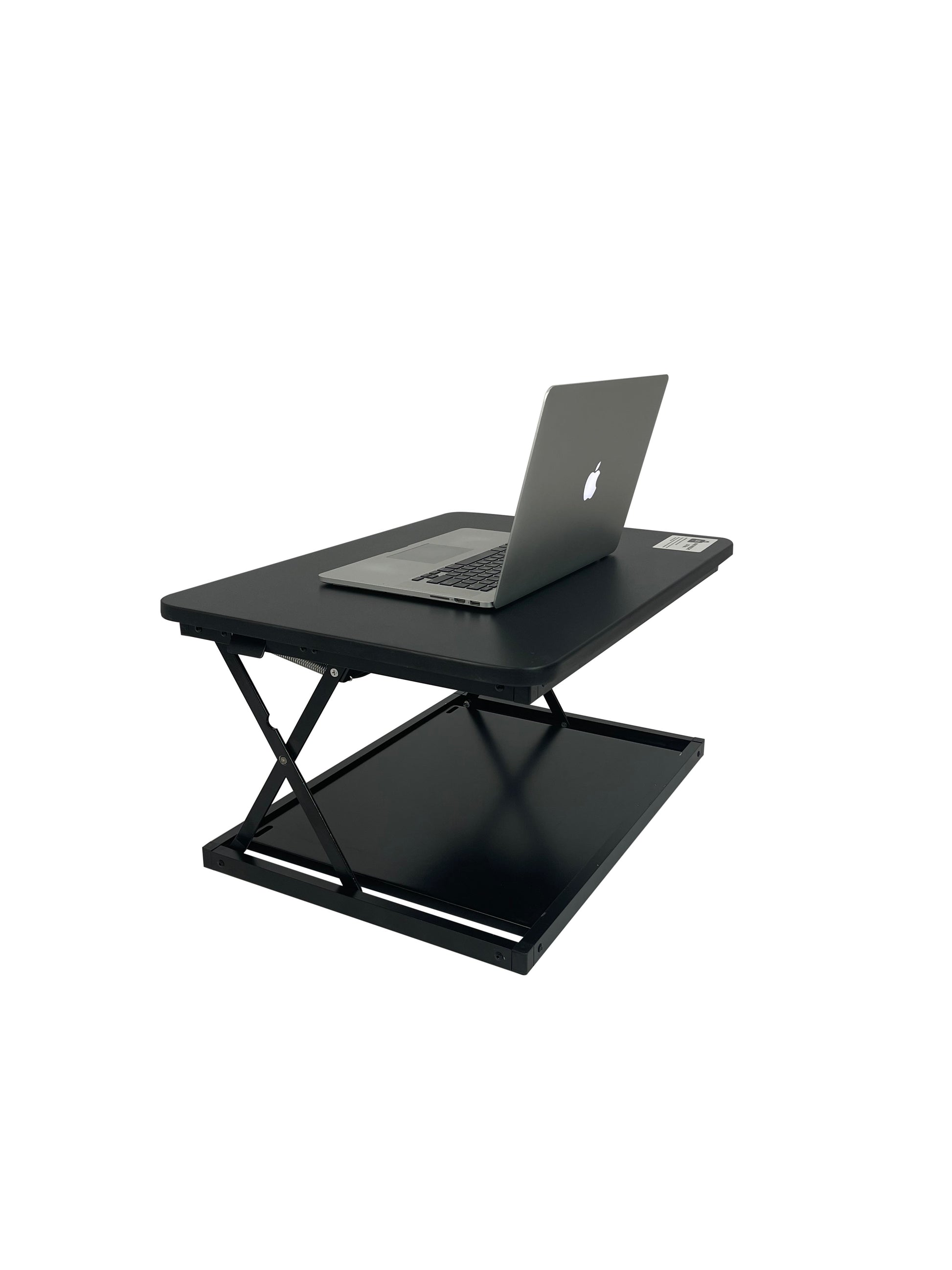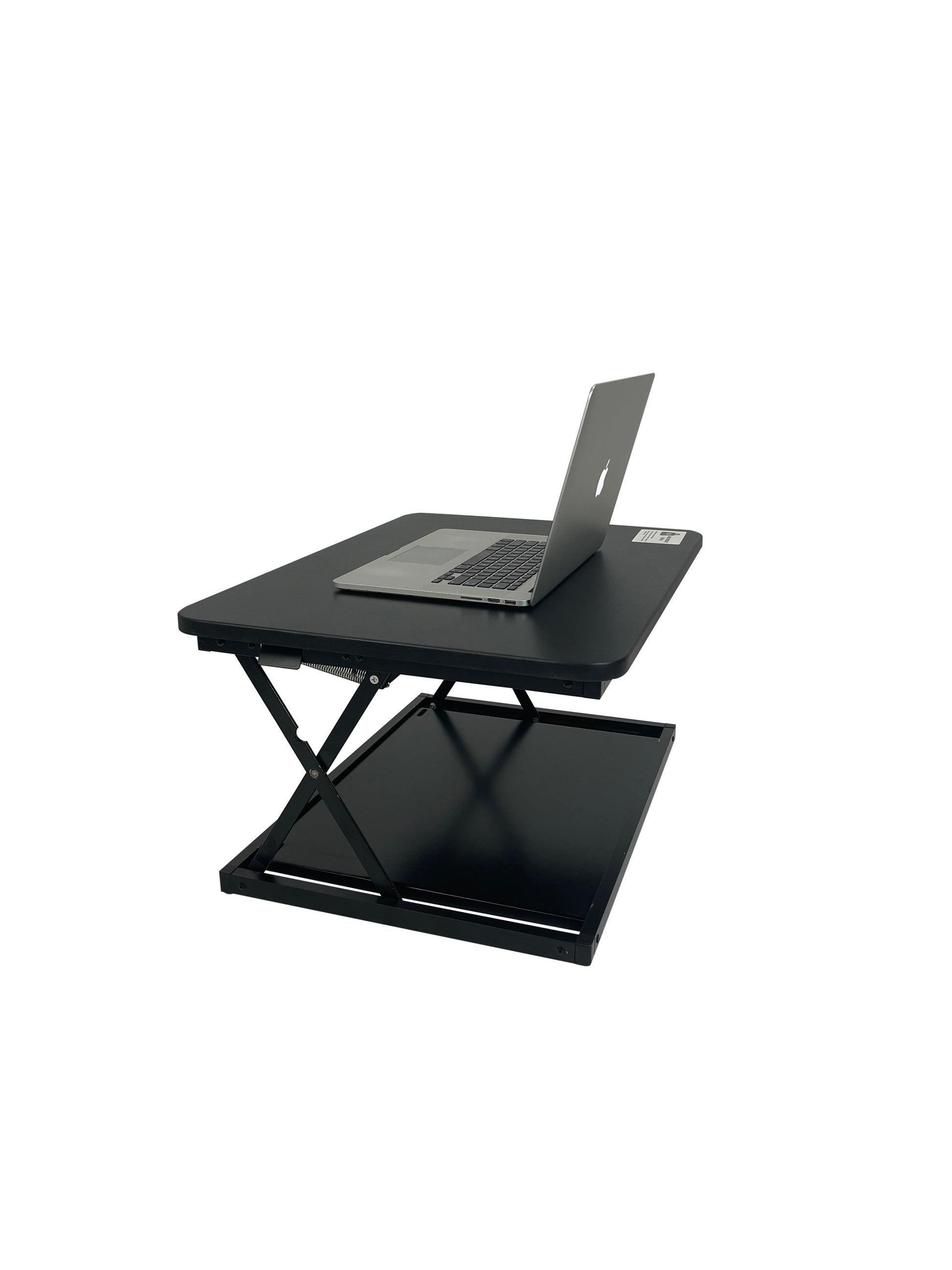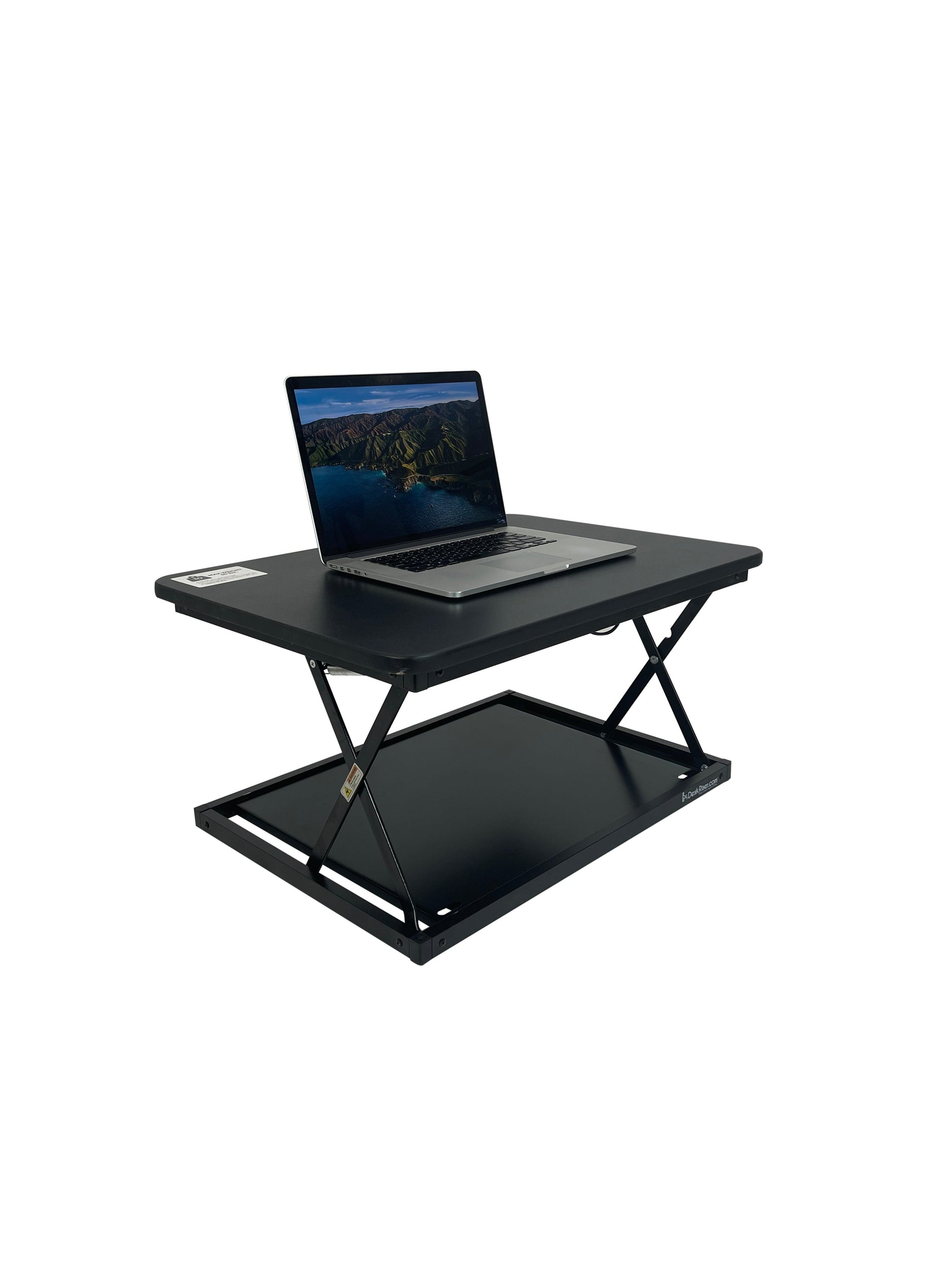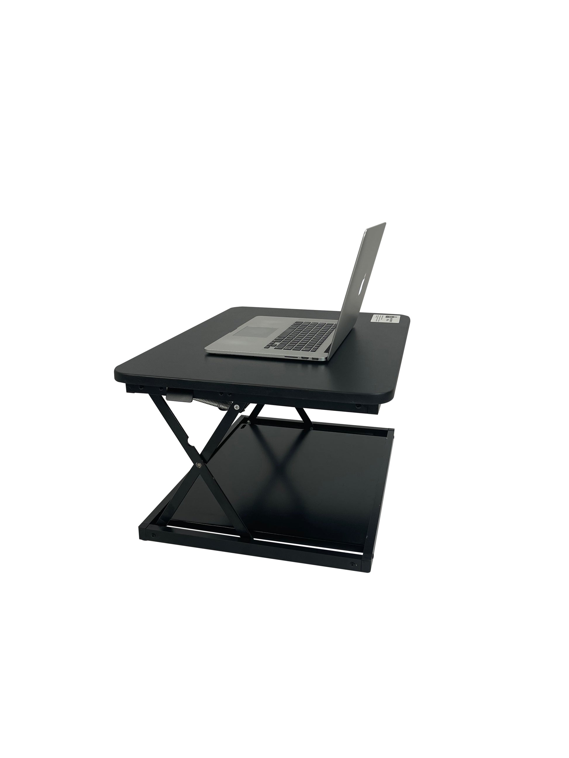 This 28-inch wide standing desk has a small footprint, collapses to only 3 inches high, and rises straight up and down. Perfect for single monitor or laptop setups. It is portable and at 25 lbs it is lightweight. Ships fully assembled and comes in a medium glossy desktop surface in black or white. The perfect small space standing desk.