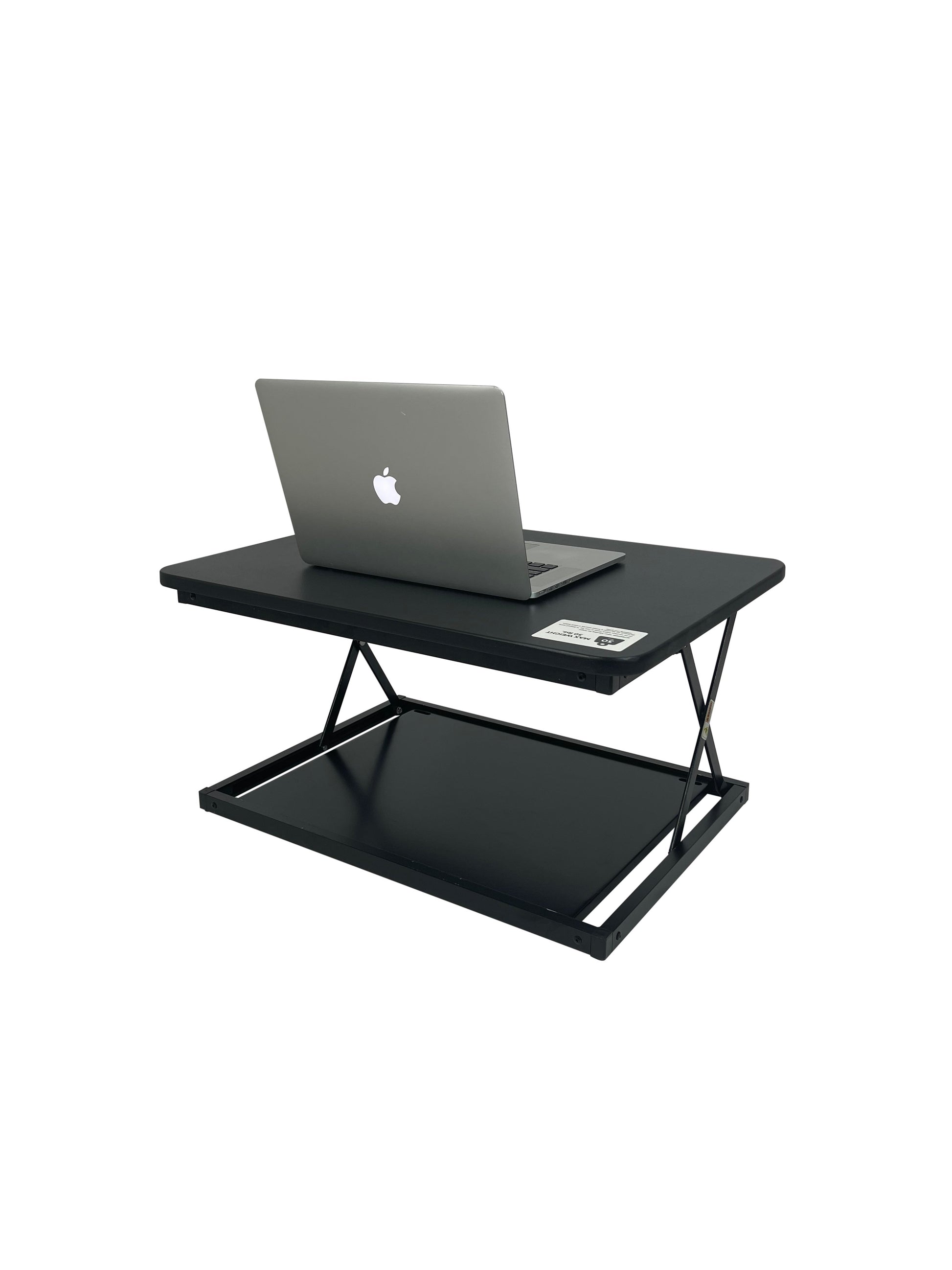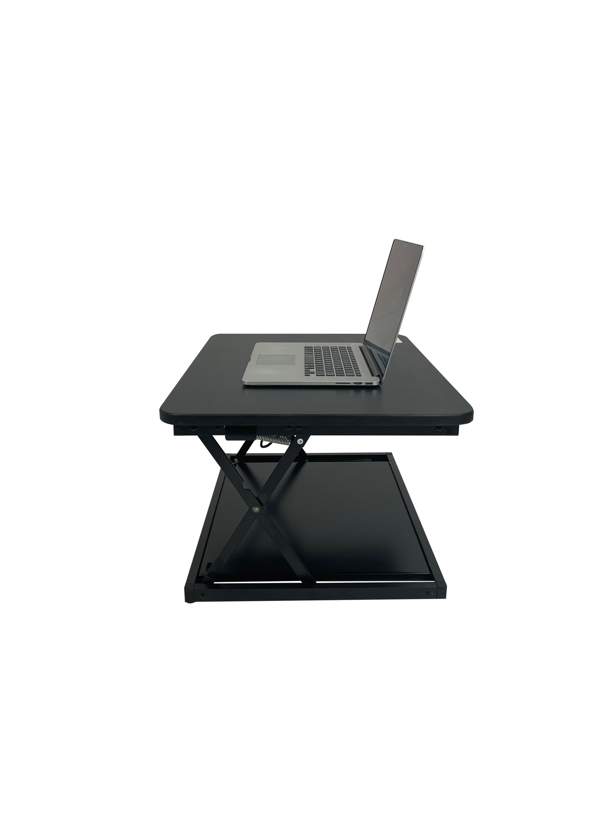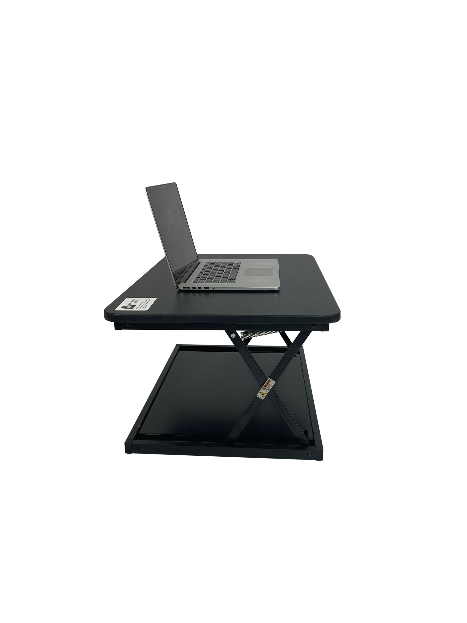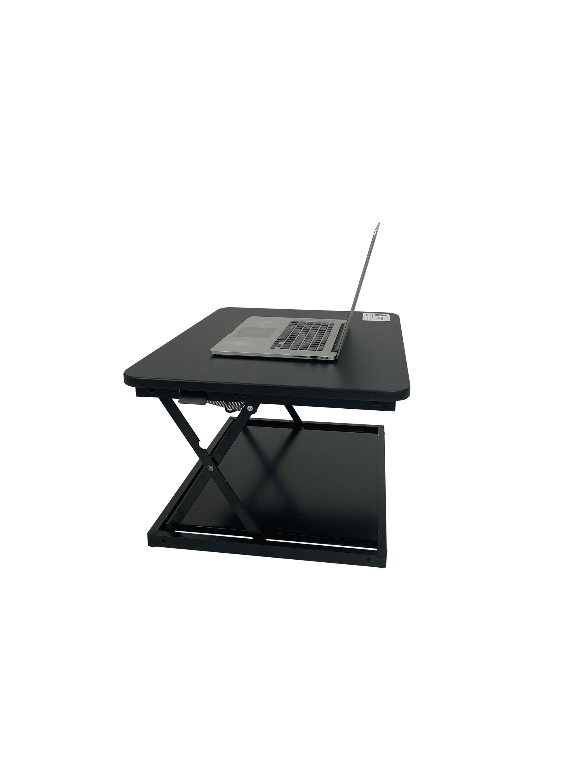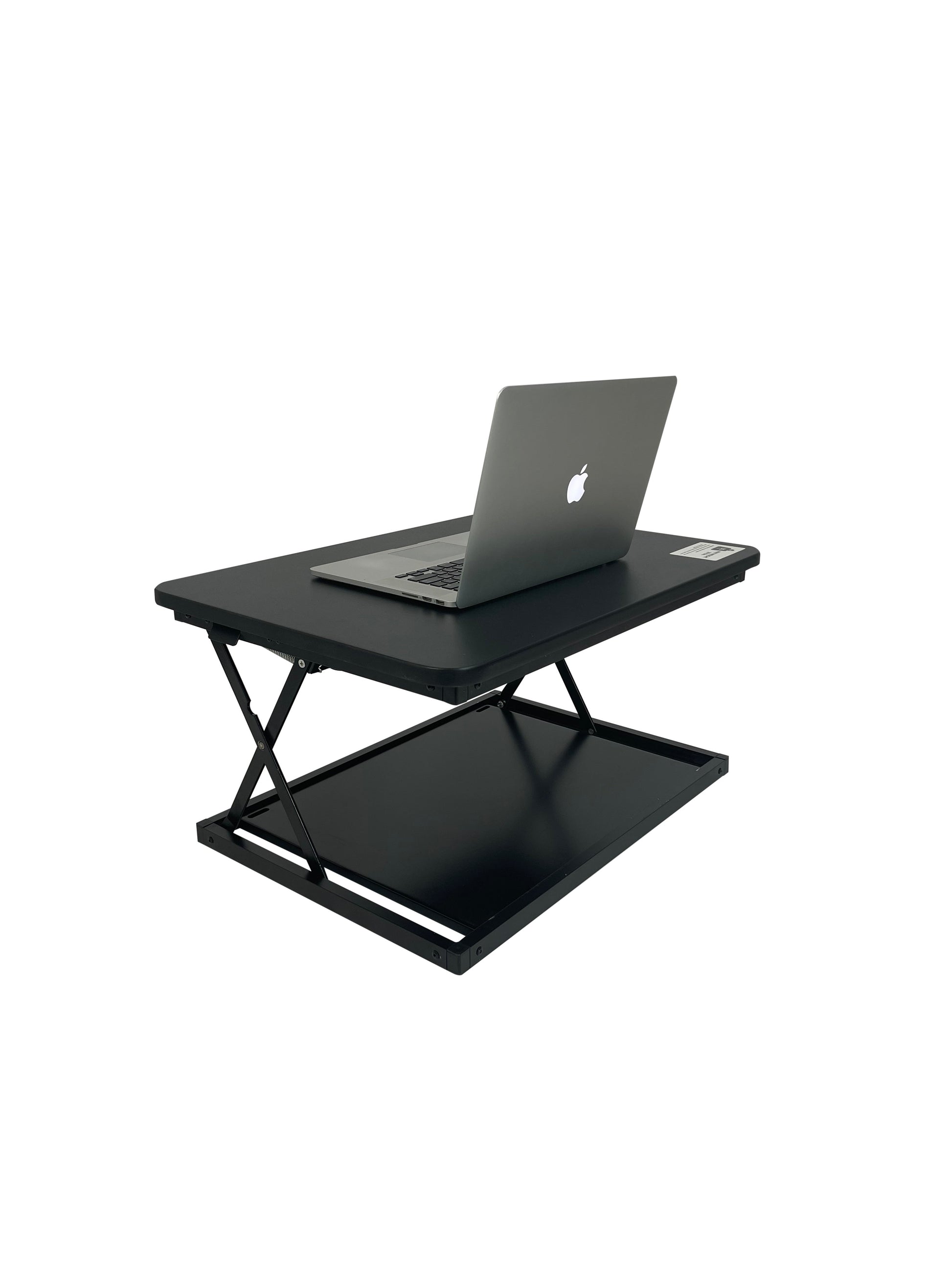 This 28-inch wide standing desk has a small footprint, collapses to only 3 inches high, and rises straight up and down. Perfect for single monitor or laptop setups. It is portable and at 25 lbs it is lightweight. Ships fully assembled and comes in a medium glossy desktop surface in black or white. The perfect small space standing desk.