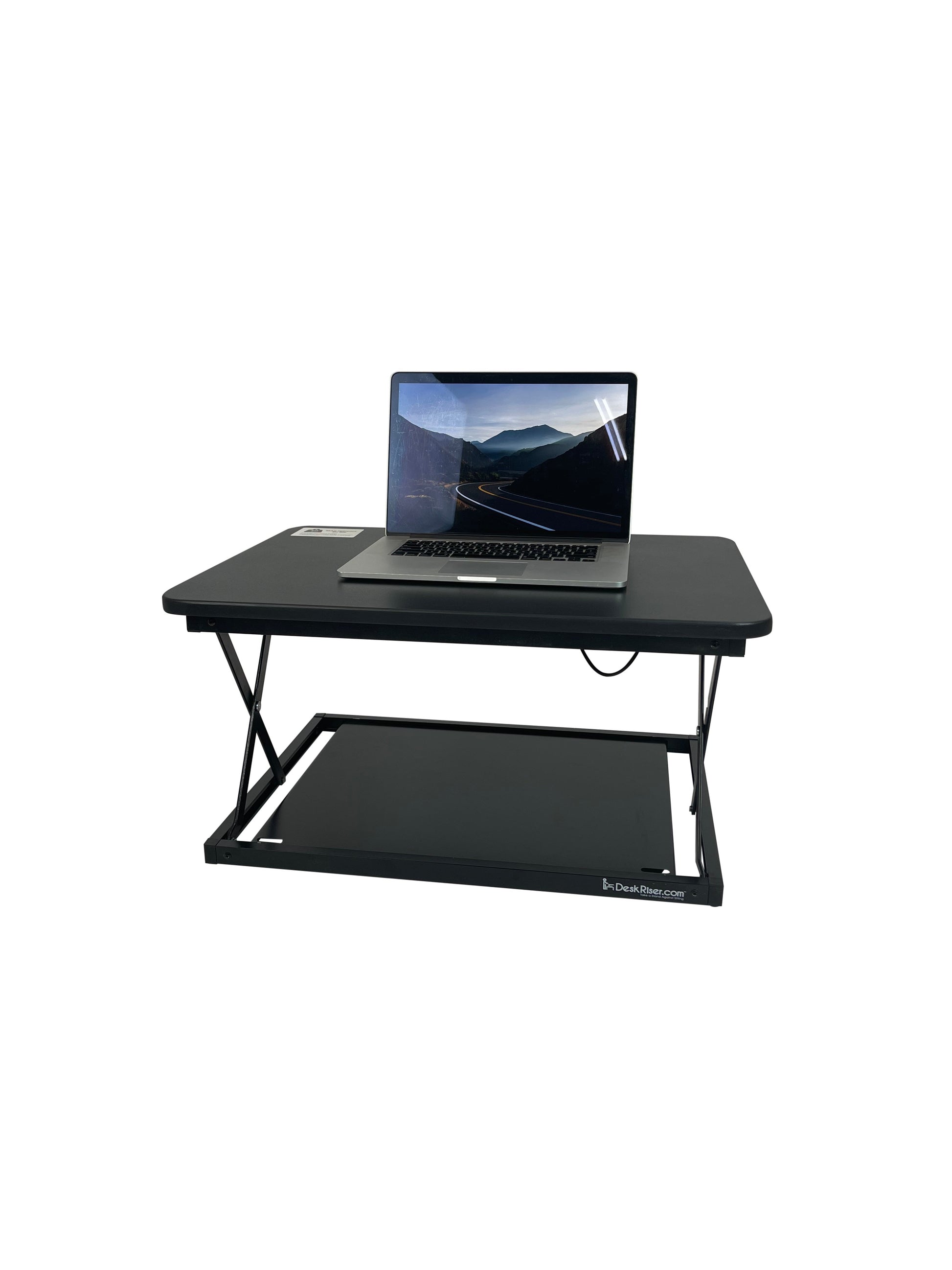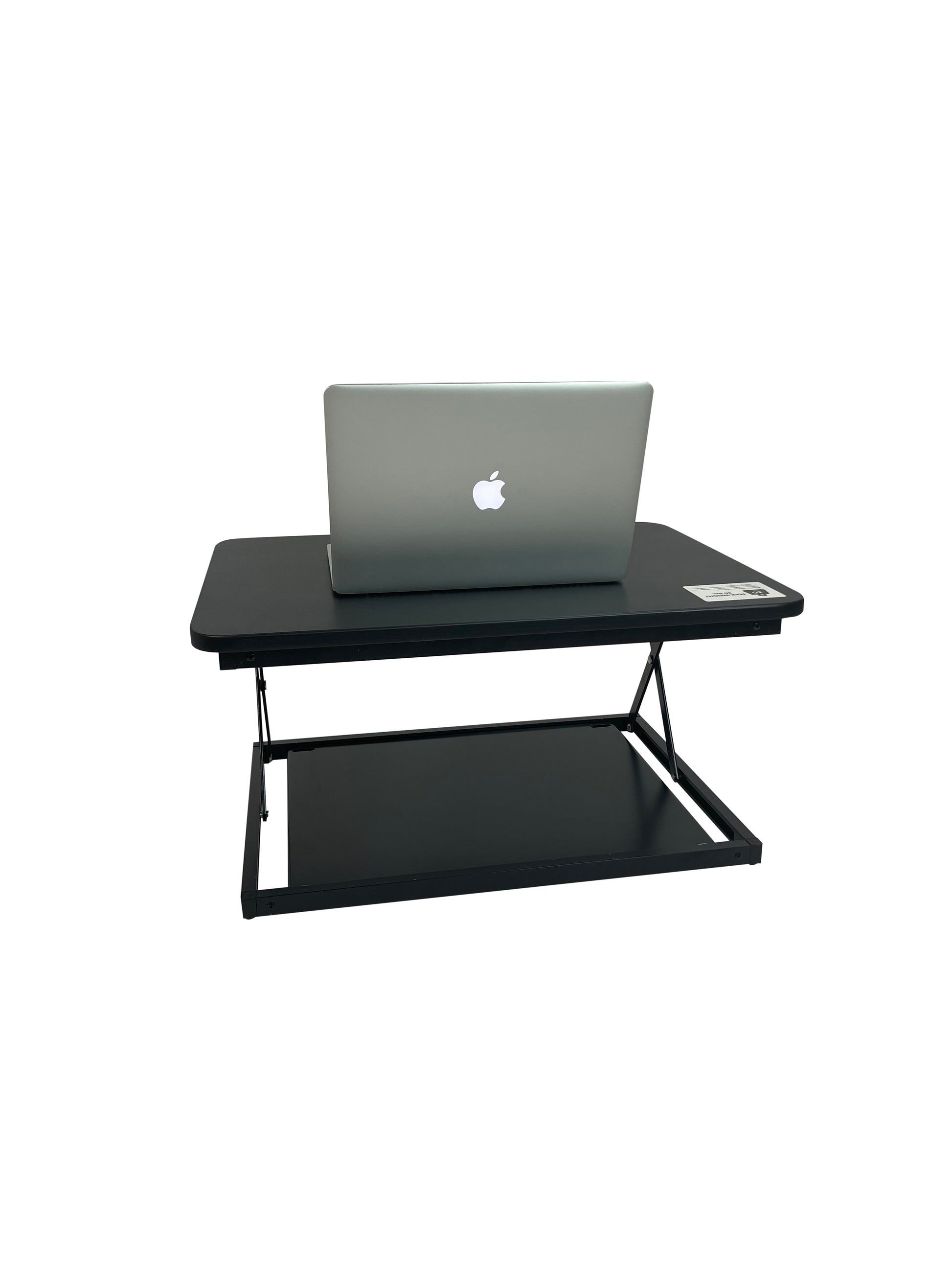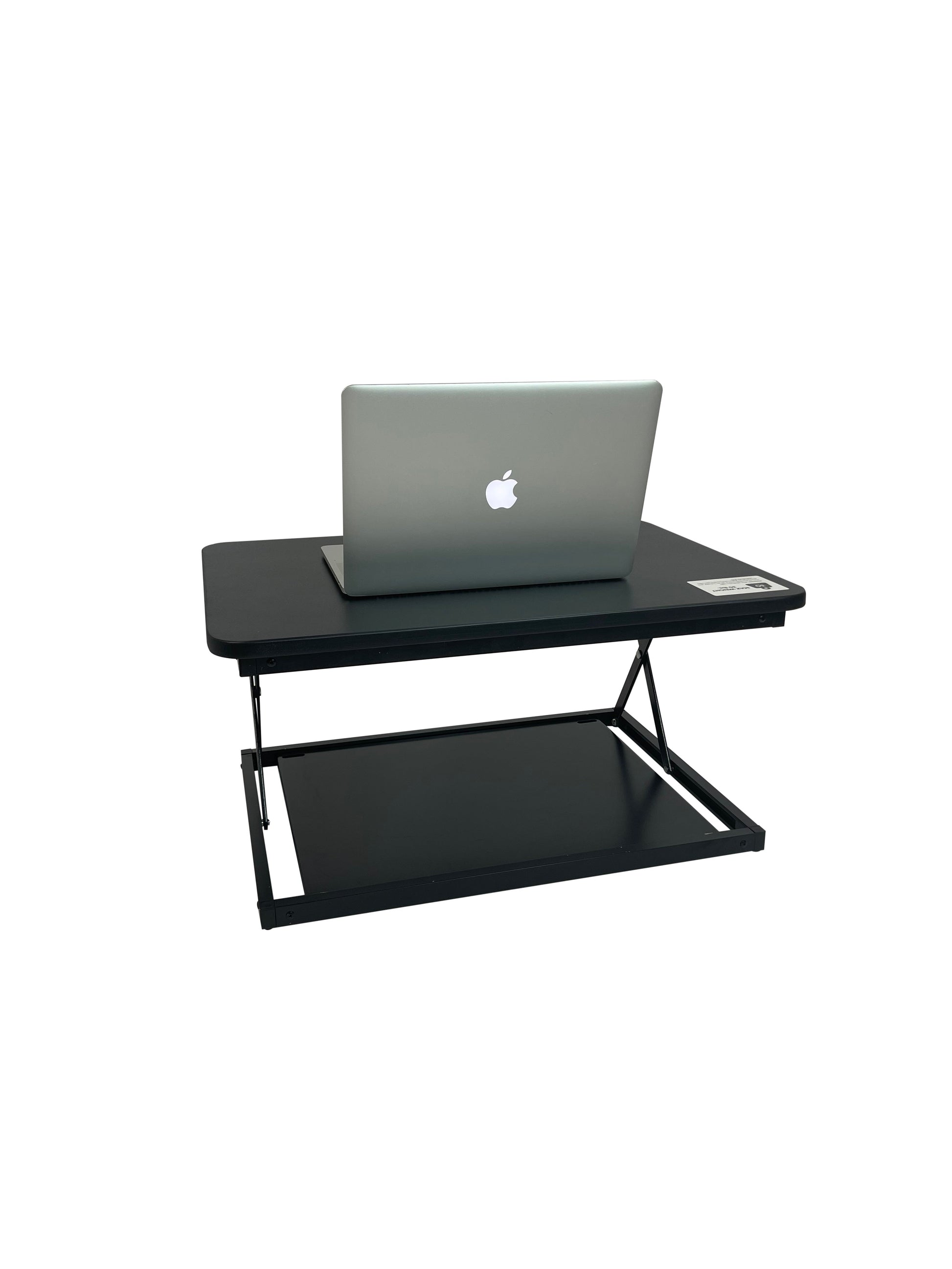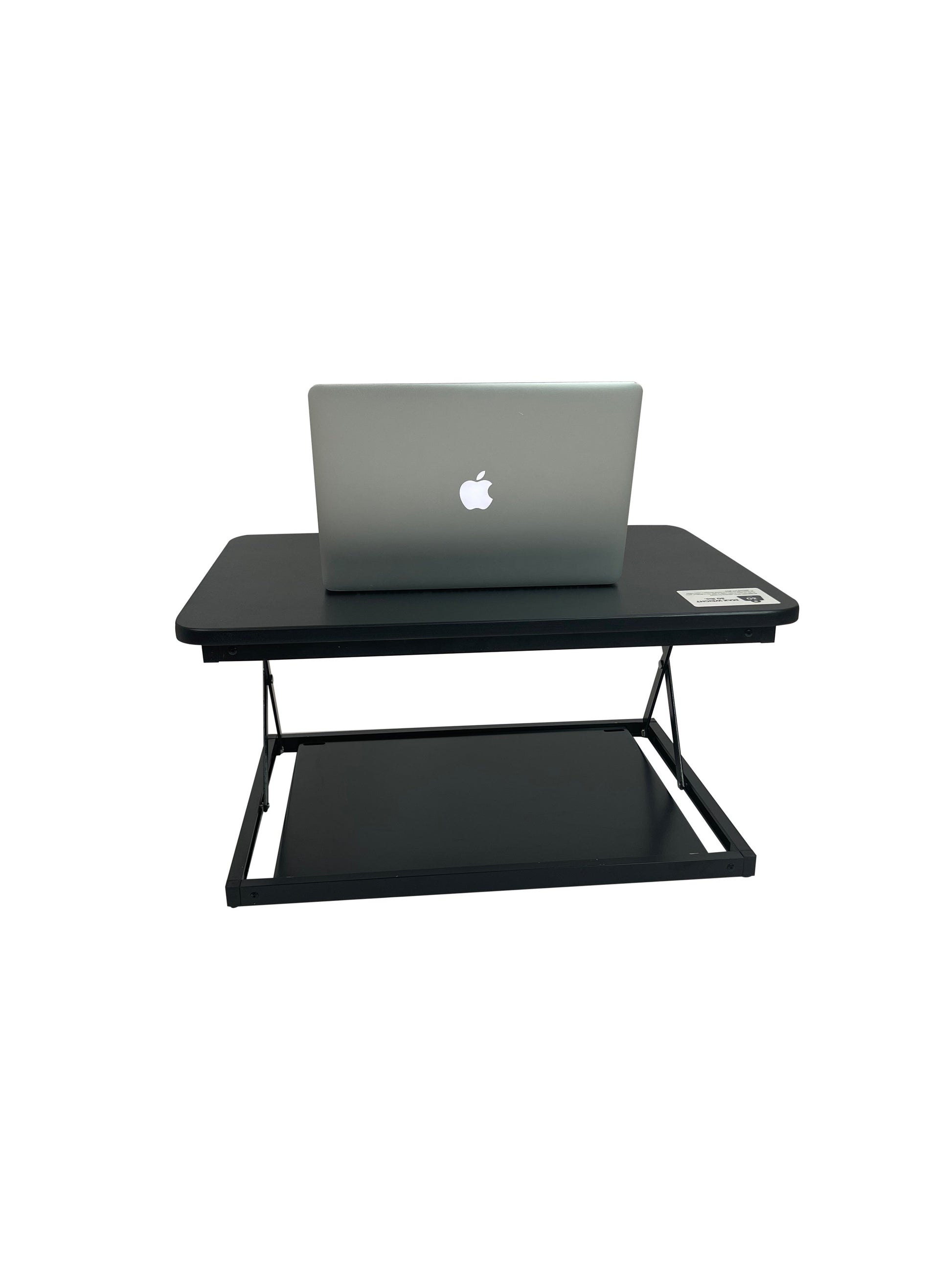 This 28-inch wide standing desk has a small footprint, collapses to only 3 inches high, and rises straight up and down. Perfect for single monitor or laptop setups. It is portable and at 25 lbs it is lightweight. Ships fully assembled and comes in a medium glossy desktop surface in black or white. The perfect small space standing desk.