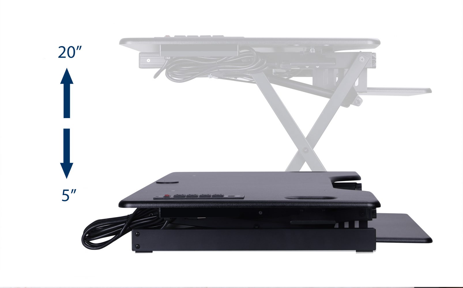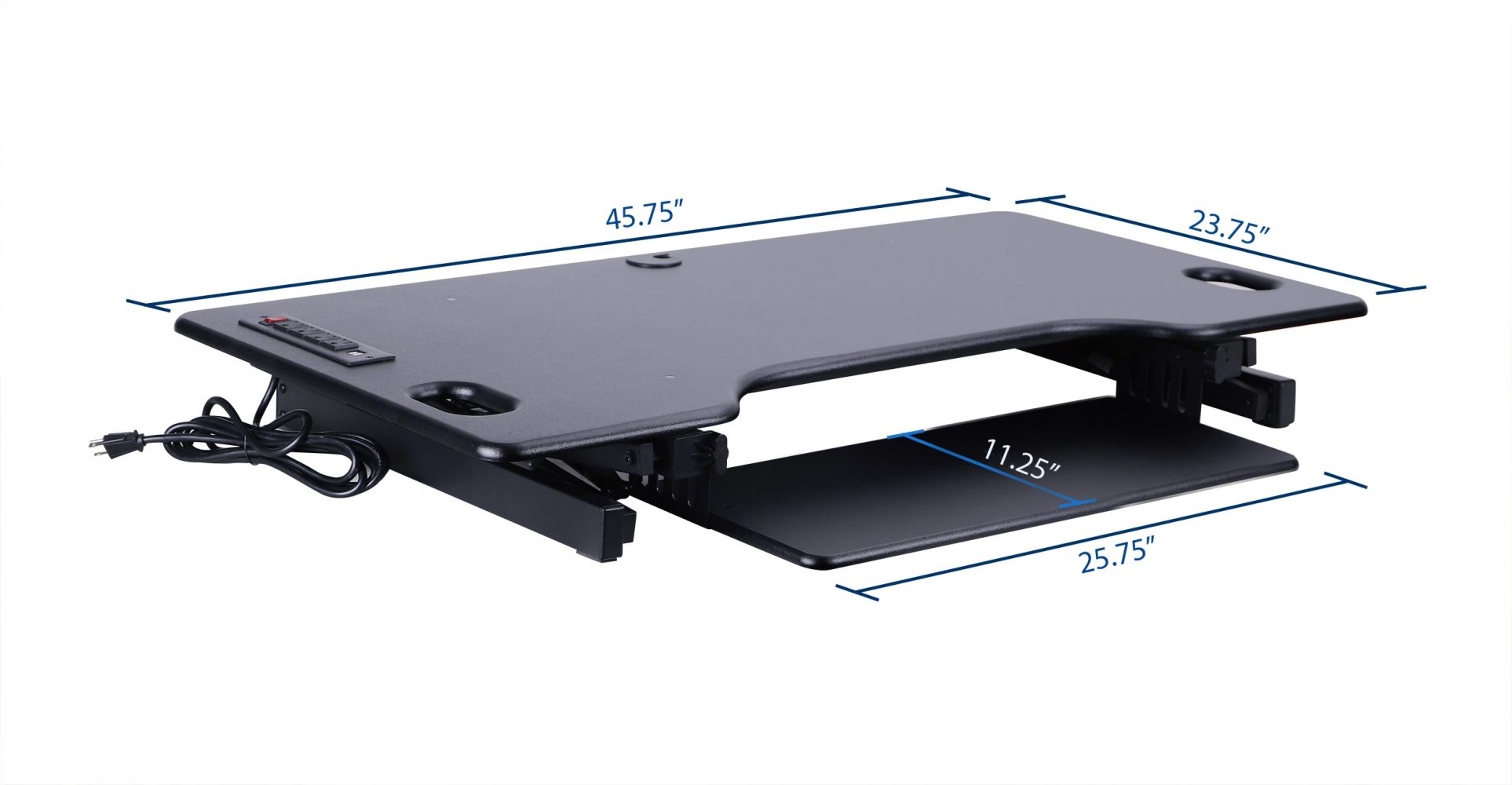 The Electric Extra Grande Desk Riser is a 46-inch wide heavy duty MANUAL standing desk converter with squeeze handles, which are assisted by gas pistons, that move the entire two-tiered shelf up and down effortlessly.