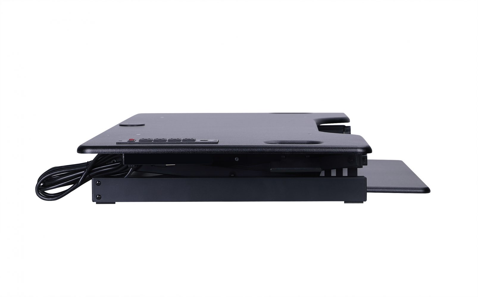 It is not an electric desk riser that moves up and down with the push of a button; however, it does feature a cord that plugs in to allow you to utilize 4 AC outlets to plug in your devices, your laptop, and/or your monitor(s).