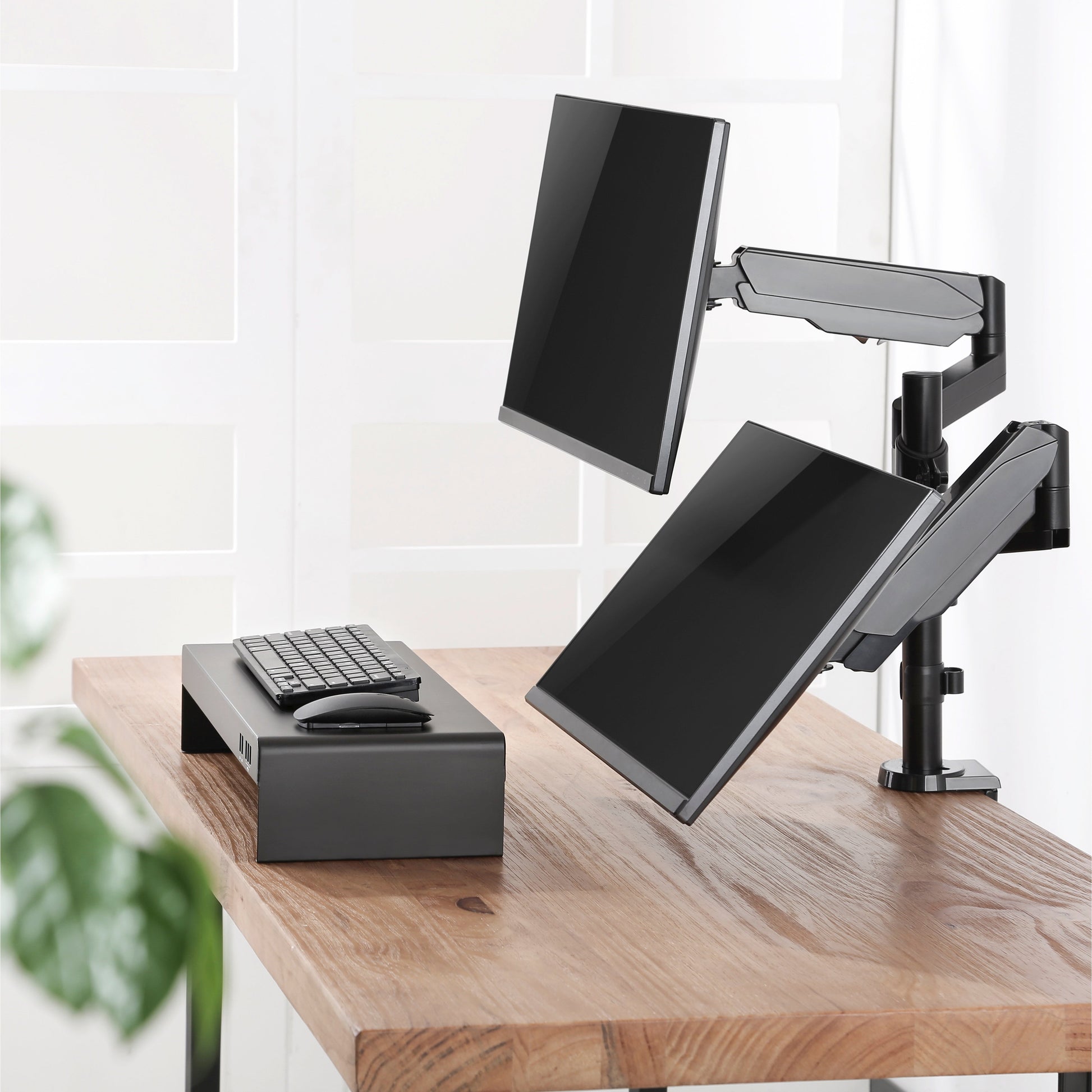 Sleek, sophisticated dual monitor arms ideal for any office desk or standing desk. This dual monitor desk mount can be attached to your desk with clamps or grommet holes. Can hold 2 x 24-inch monitors and can support up to 17 lbs on each arm. Features quick-release VESA plates so that you can switch out monitors with ease. Each monitor can be tilted, pivoted or swiveled to adjust to your height and for proper ergonomics.