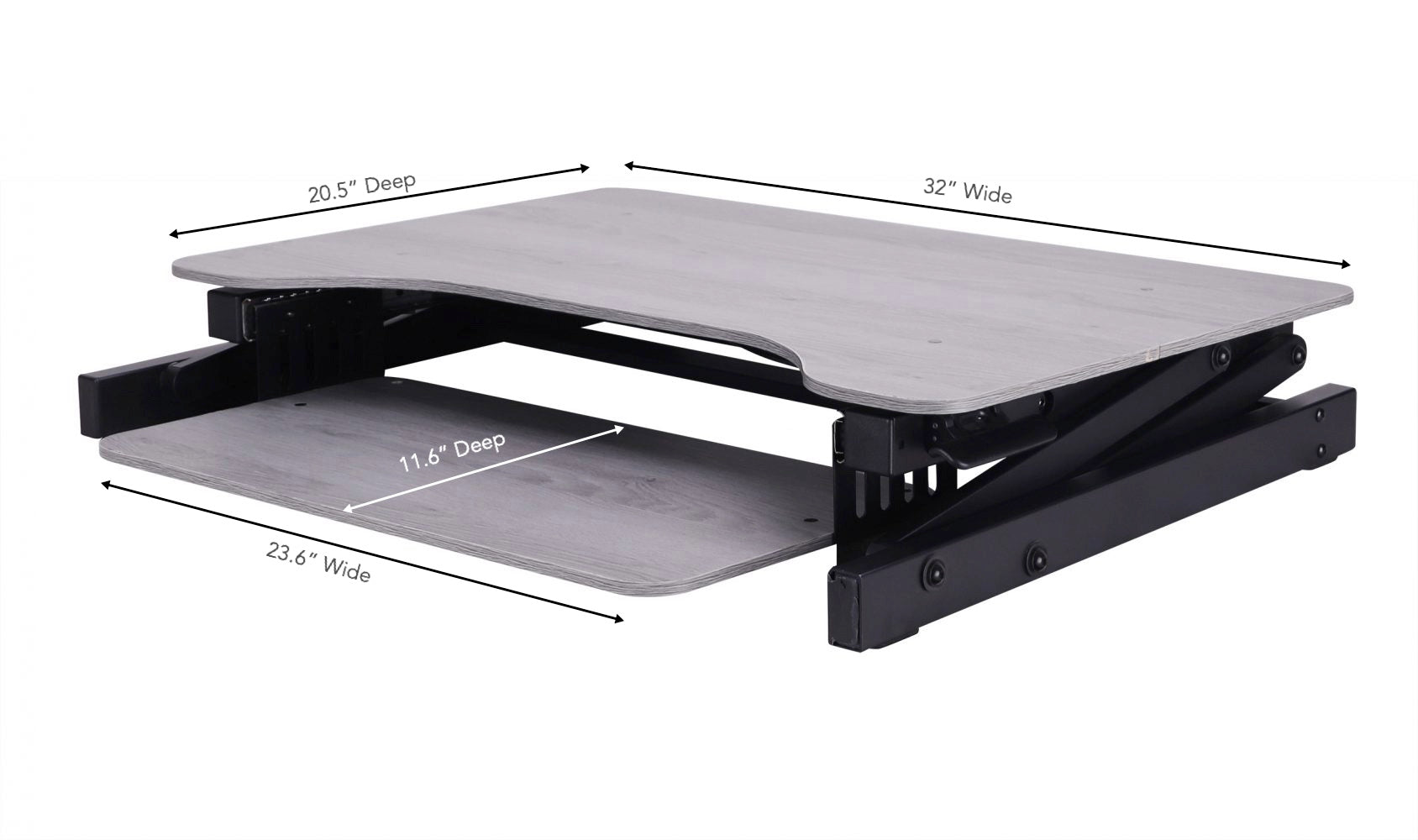 There is nothing worse than feeling cramped while working at your computer. The Gray Desk Riser Classic features an ultra wide 32"W x 20.5"D work surface, large enough to fit your two 24" monitors, notepads, pens and your smartphone.