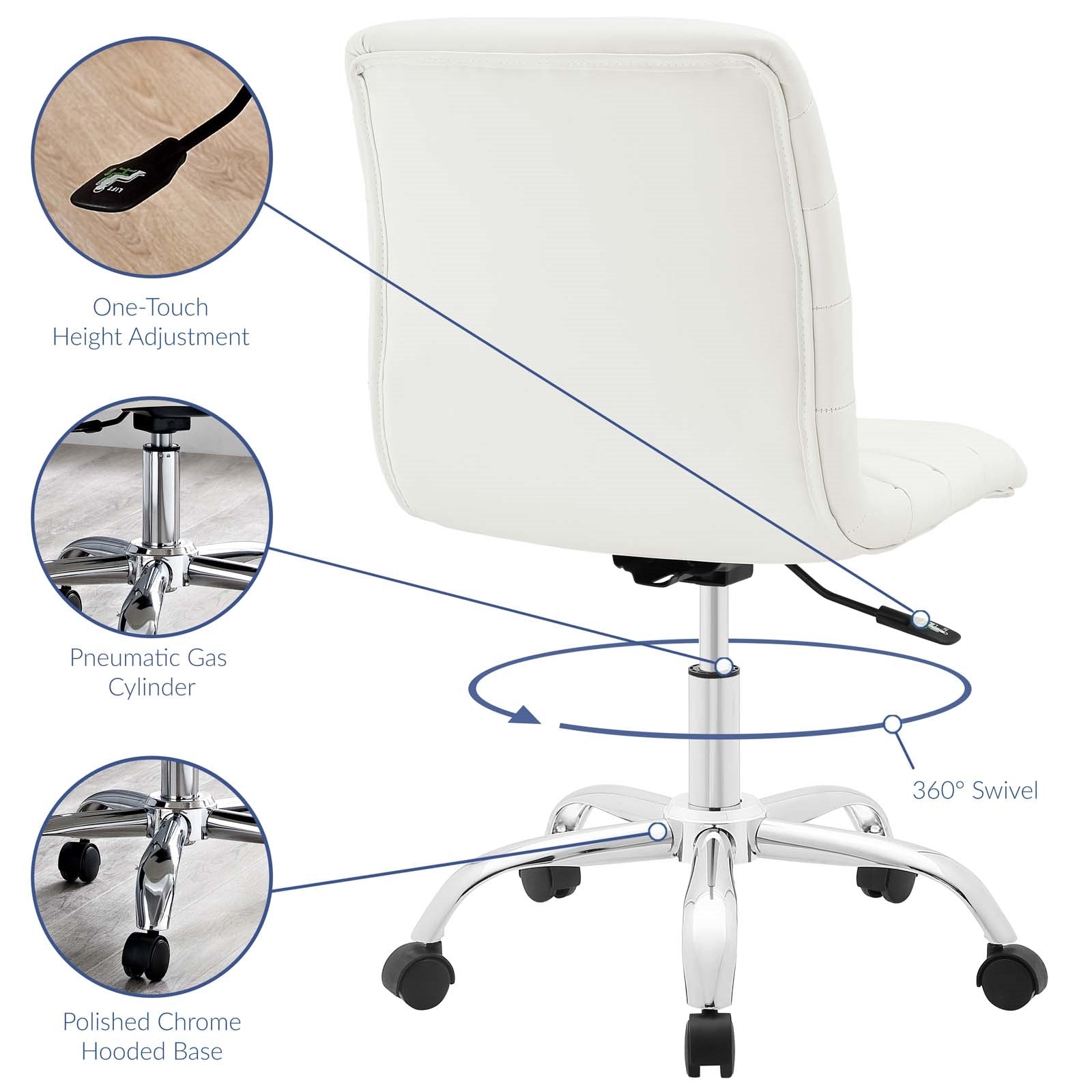 As with the ripple after-effects caused by the toss of a pebble, there’s no telling where the Jesse armless office chair will take you. For those who appreciate natural resolve, without the need to know the destination point, then Jesse is for you. Outfitted with a polished chrome steel frame and five dual-wheel casters for easy mobility over hardwood or carpeted surfaces, the padded vinyl Jesse armless office chair begins and ends with innovation. Jesse is perfect for conference rooms and workstations, features fine stitching and trim throughout, and comes fully height adjustable with a 360-degree swivel.The Fine Print