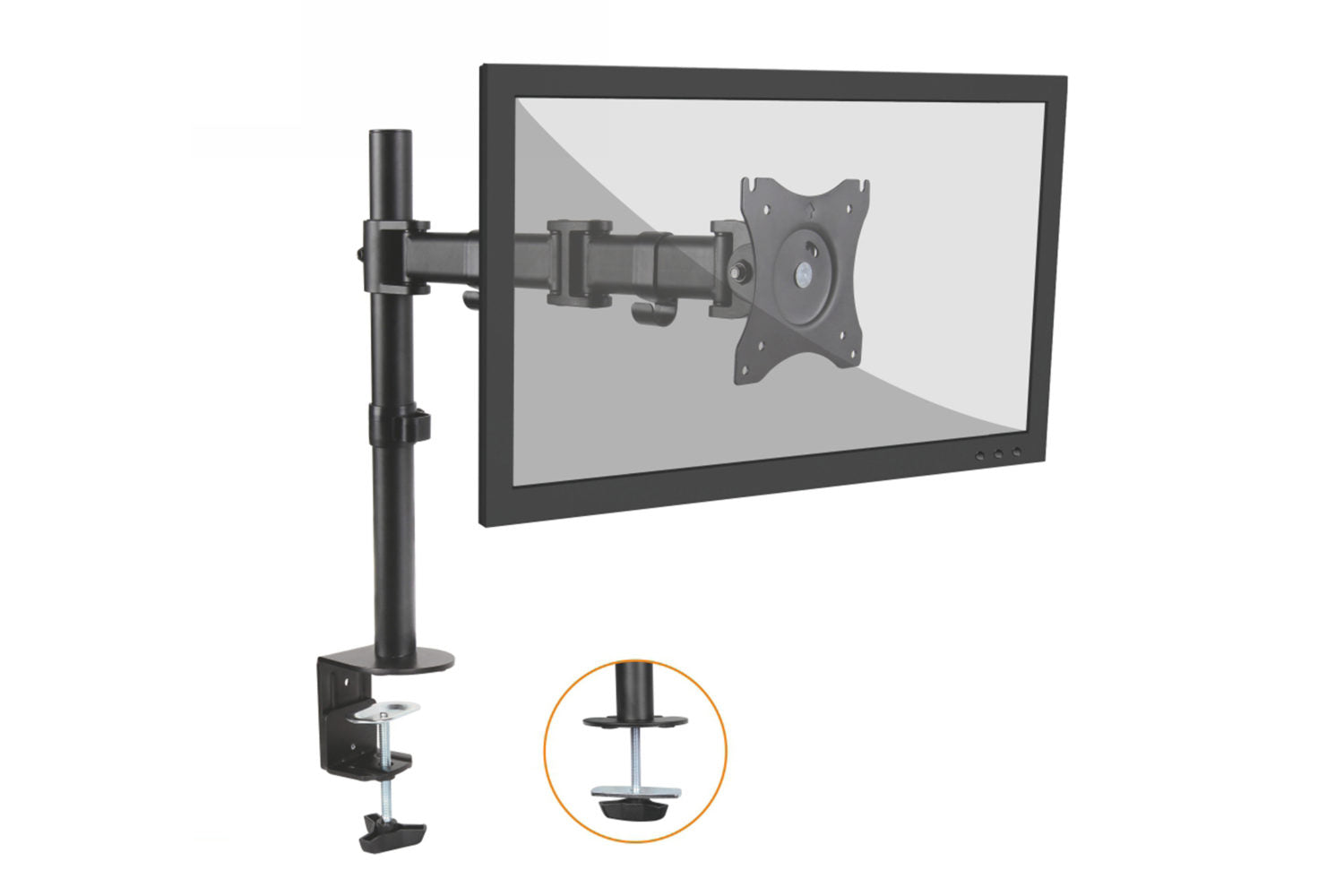 The Josie Single Monitor Arm is a single monitor desk mount arm that can mount to your desktop using either a clamp or a grommet hole. This desk monitor mount features an adjustable height pole to help you set up the ideal ergonomic workstation. It mounts onto any surface that is between 0.4 inches thick and 3.5 inches thick and fits any monitor between 13-inch and 32-inch wide. Tilts + or – 45 degrees, swivels 180 degrees, rotates 360 degrees, fits VESA 75x75mm & 100x100mm and cable management clips are included. Supports up to 17 lbs.