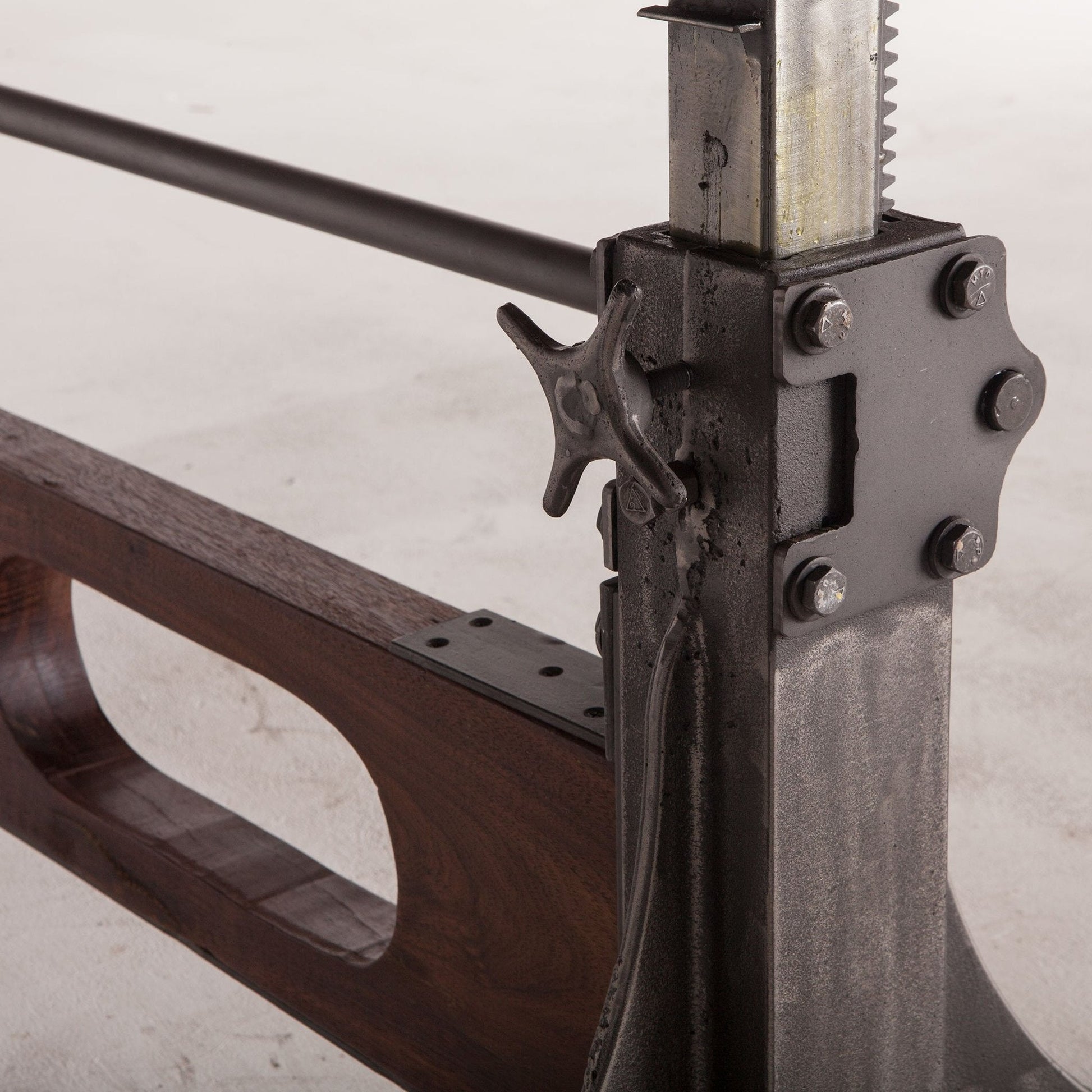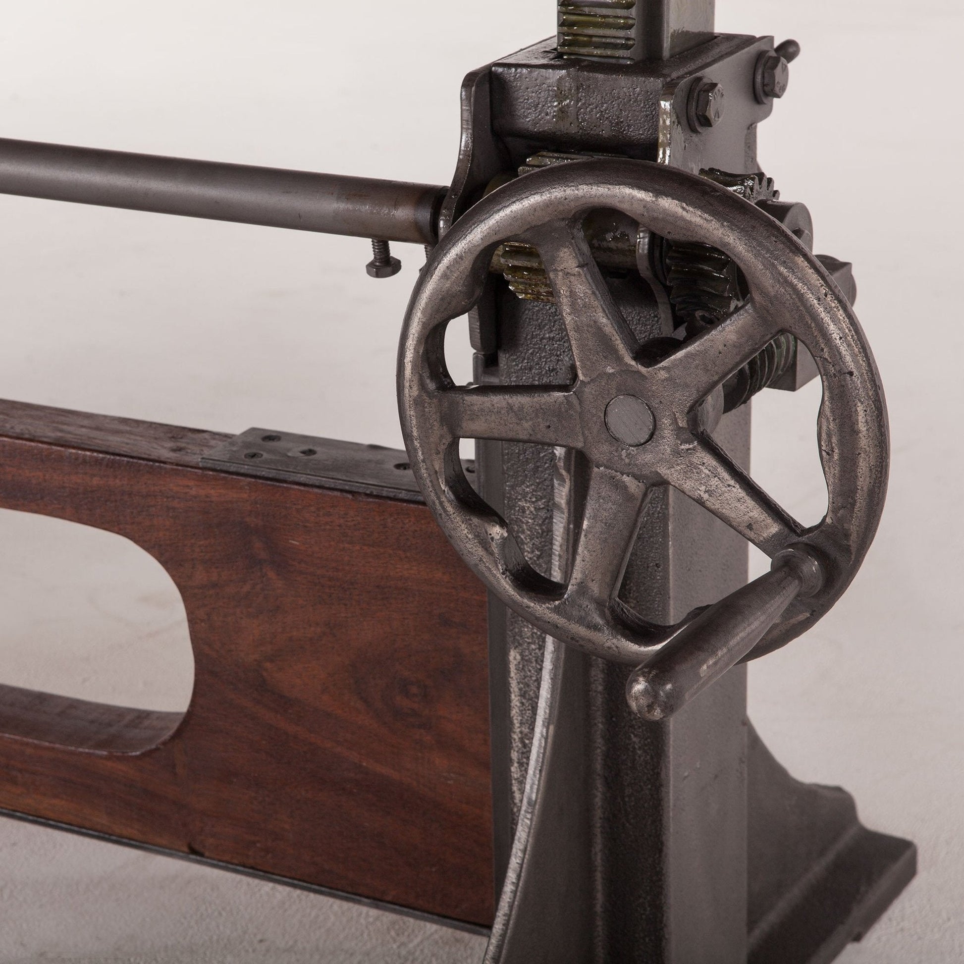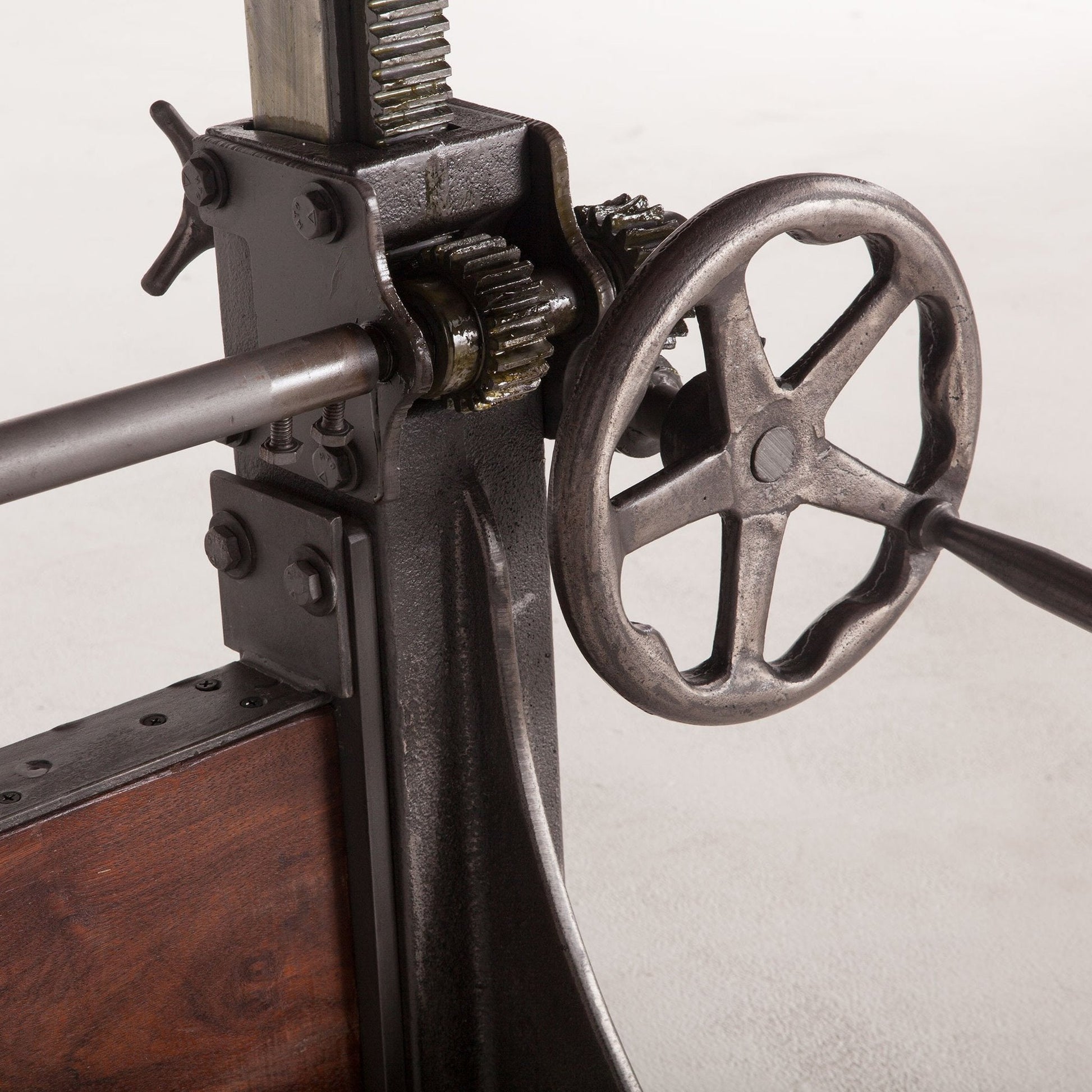 Industrial old world style wheel crank mechanism is operated by hand and is connected to the right side of the iron case base with a gear shaft that helps you easily lift and lower the table as you turn the wheel.