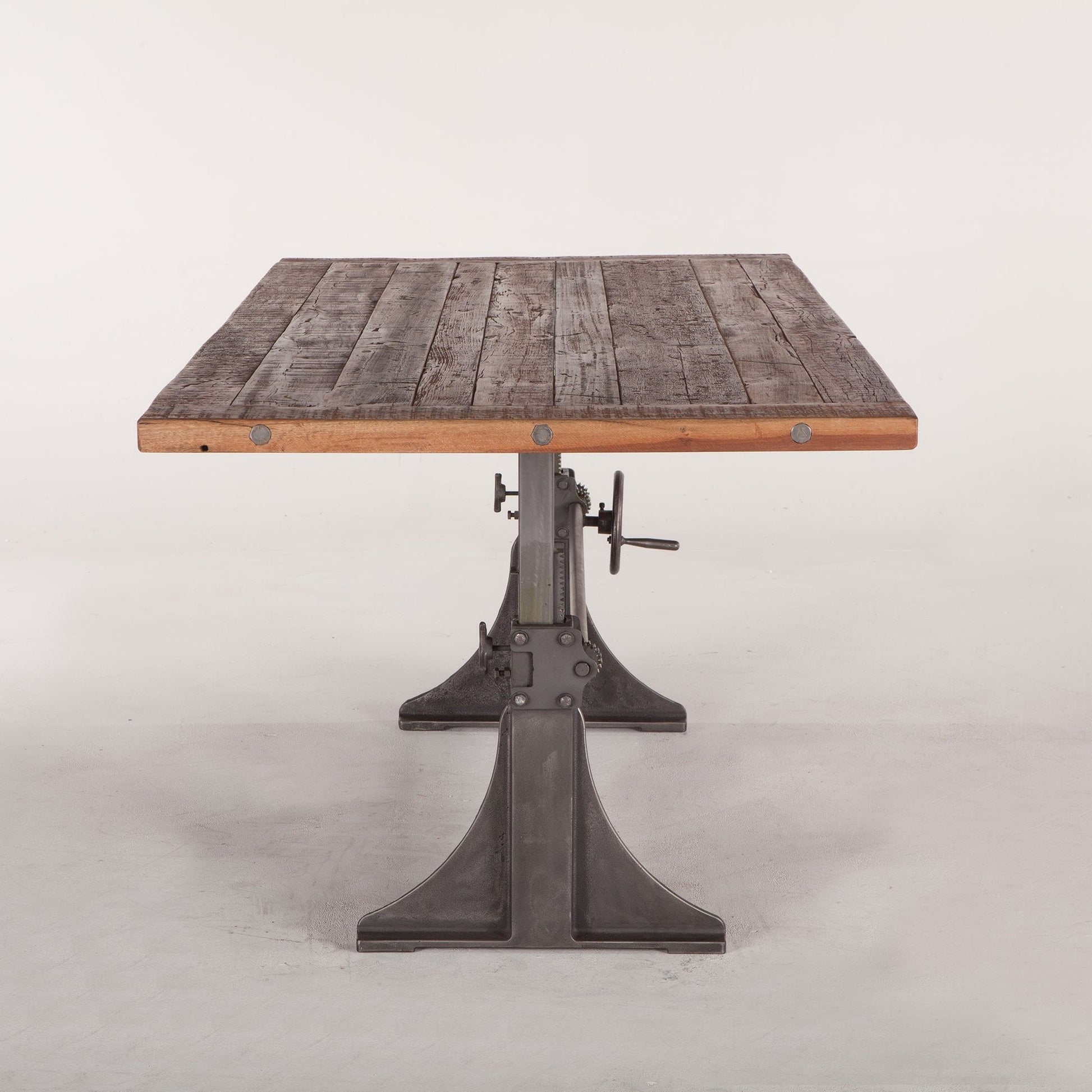Reclaimed teak wood and iron fuse together in this beautiful blend of art and function with our Michael industrial crank table, creating a truly magnificent office table. Crafted exclusively from reclaimed materials, the Michael Adjustable Crank Table features charming details like the vintage, antique hand crank attached to a gear on the cast iron base that helps lift and lower the table with ease.