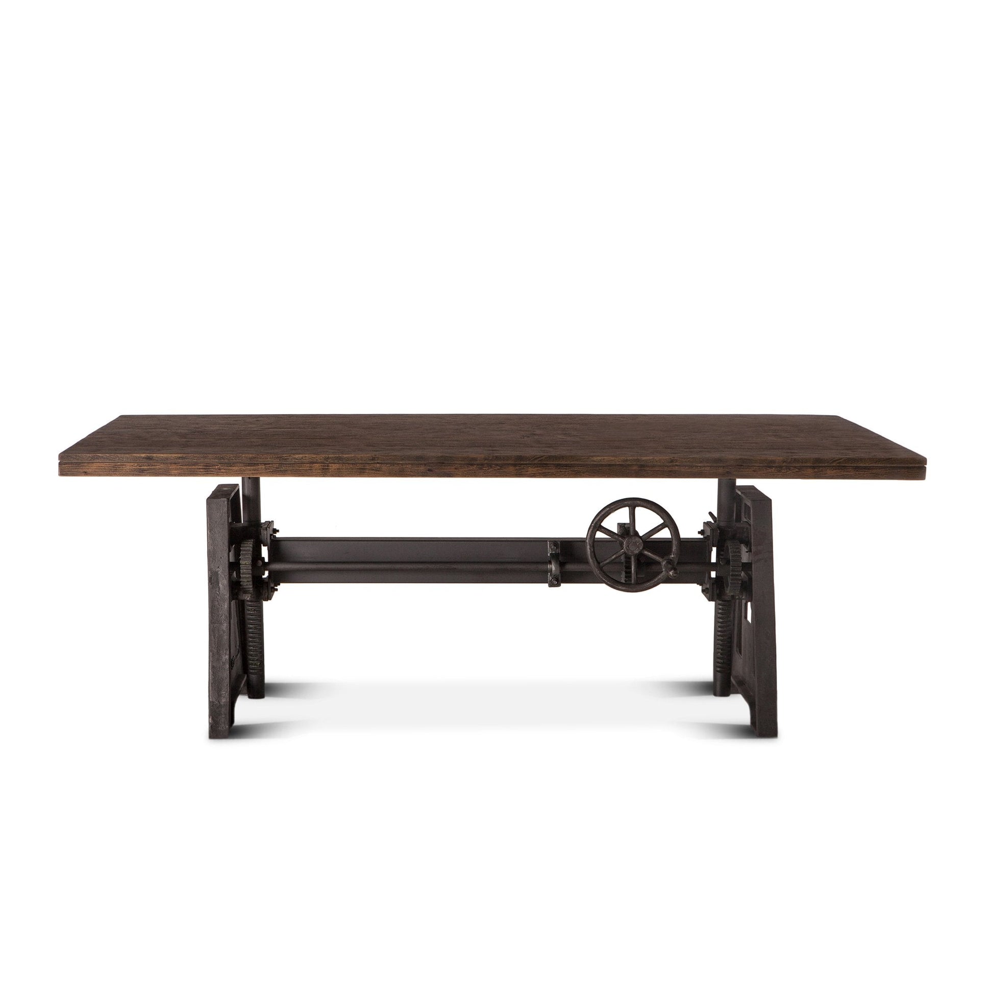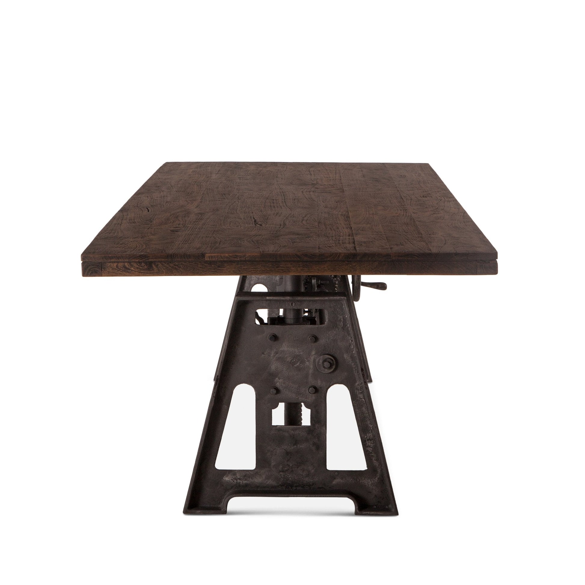 This industrial crank adjustable conference table or desk is 84 inches wide and has a sustainably sourced mango wood top featuring clean edges. It is a heavy duty table with an old world style iron cast base. Affixed to both ends of the base of the table top are two rods that fit into the cast iron base where the industrial crank mechanism is connected to an antique styled handle, allowing the table's top to be raised or lowered to whatever height works best for your needs. The exquisite, hand-forged natural iron cast base creates a beautiful fusion of natural and industrial elements with the mango wood top.