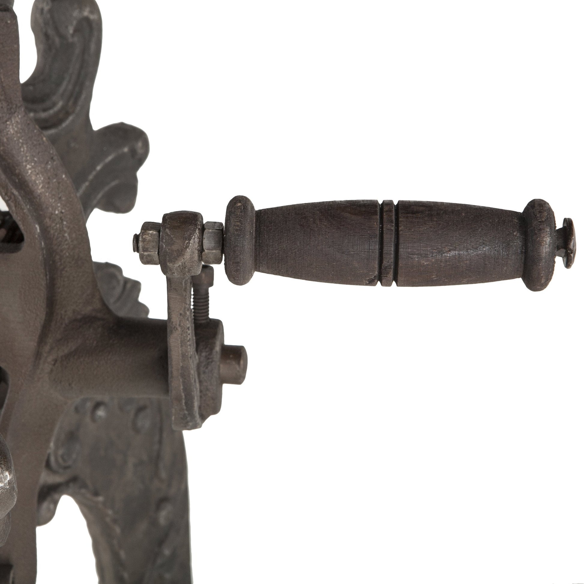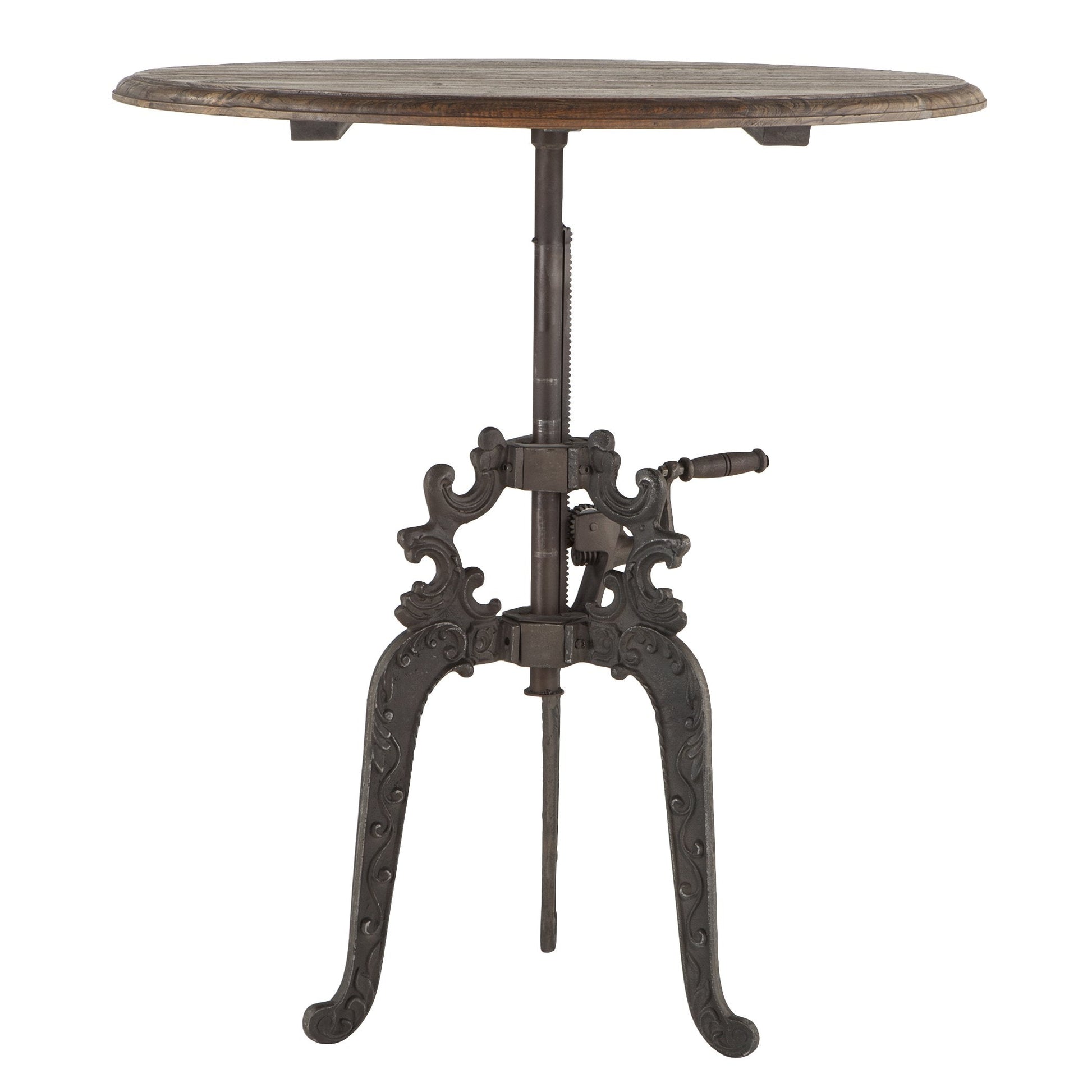 Industrial old world style wheel crank mechanism is operated by hand and is connected to the iron cast base and adjusts the table up and down smoothly and easily aided by a series of gears connected to rods.