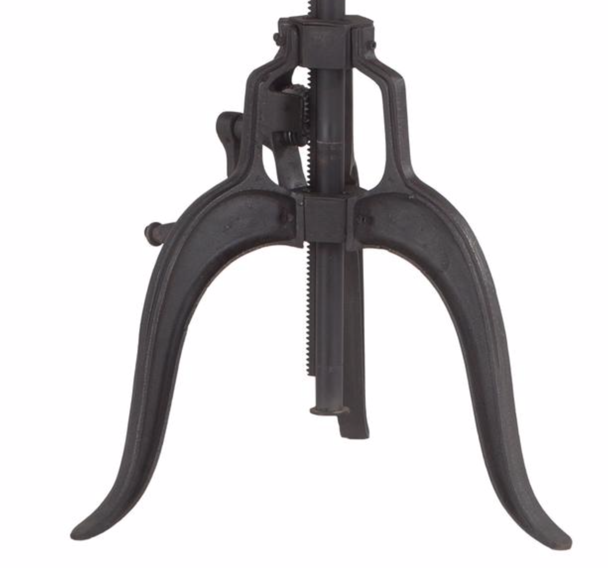 Industrial old world style wheel crank mechanism is operated by hand and is connected to the iron cast base and adjusts the table up and down smoothly and easily aided by a gear connected to the base.